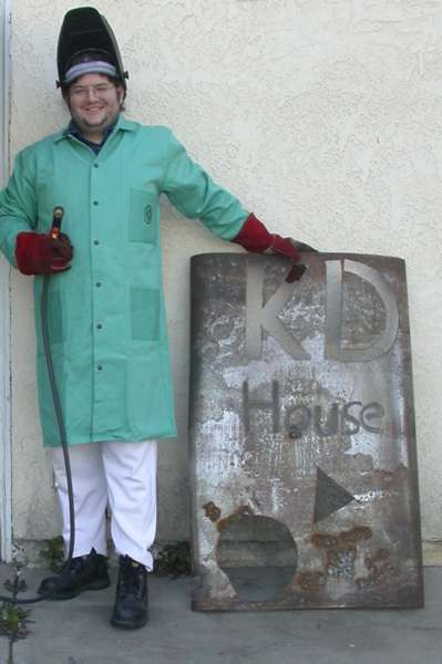KD in new shop monogrammed coat (thanks Nancy and Chip) next to KDHouse sign that he made for the Junkyard Wars Audition / Birthday Party